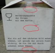 Vær opmærksom på at du ikke må åbne pakker før du har givet chaufføren en underskrift, det er netop derfor vigtigt at du tjekker kartonernes tilstand udefra. Er kartonerne ikke beskadiget kan fælgene ikke være defekte på baggrund af en transportskade. Der findes kun få steder på kartonerne som kan medvirke til at fælgene har taget skade under transporten. De typiske steder ser du på følgene billede: